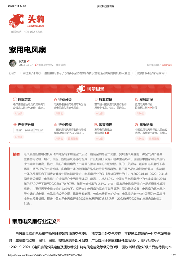 【头豹研究院】【20230808】家用电风扇 头豹词条报告系列-20页