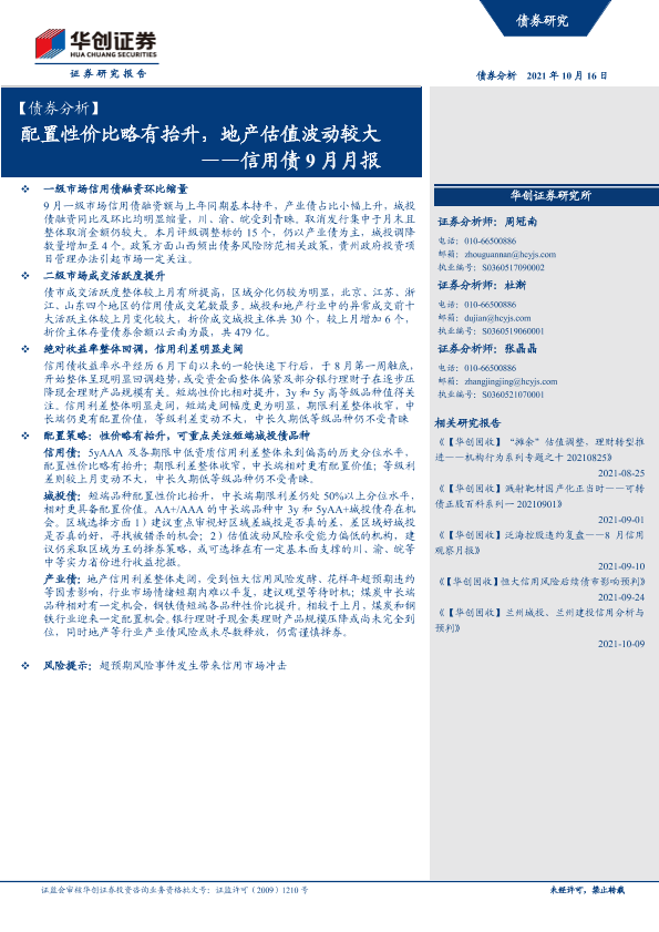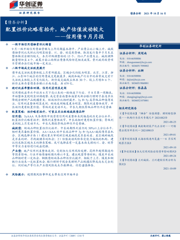 【华创证券】【20211016】信用债9月月报:配置性价比略有抬升,地产估值波动较大-37页