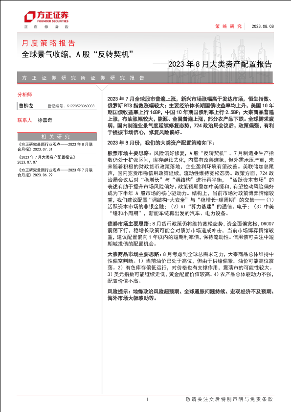 【方正证券】【20230808】2023年8月大类资产配置报告:全球景气收缩,A股“反转契机”-22页