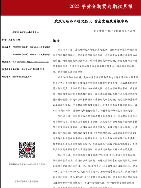 【方正中期期货】【20230805】2023年黄金期货与期权月报:黄金市场7月行情回顾及8月展望-65页