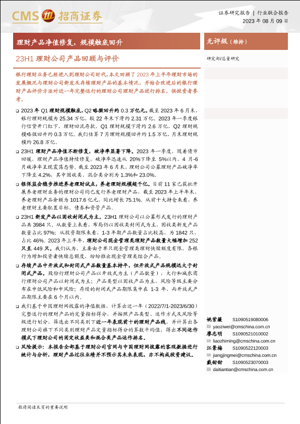 【海通证券】【20230809】23H1理财公司产品回顾与评价:理财产品净值修复,规模触底回升-21页
