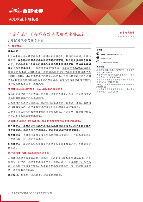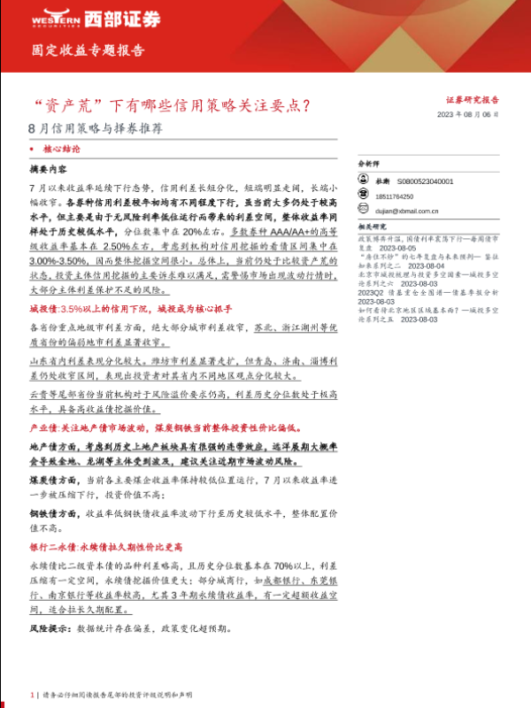 【西部证券】【20230806】8月信用策略与择券推荐:“资产荒”下有哪些信用策略关注要点?-17页