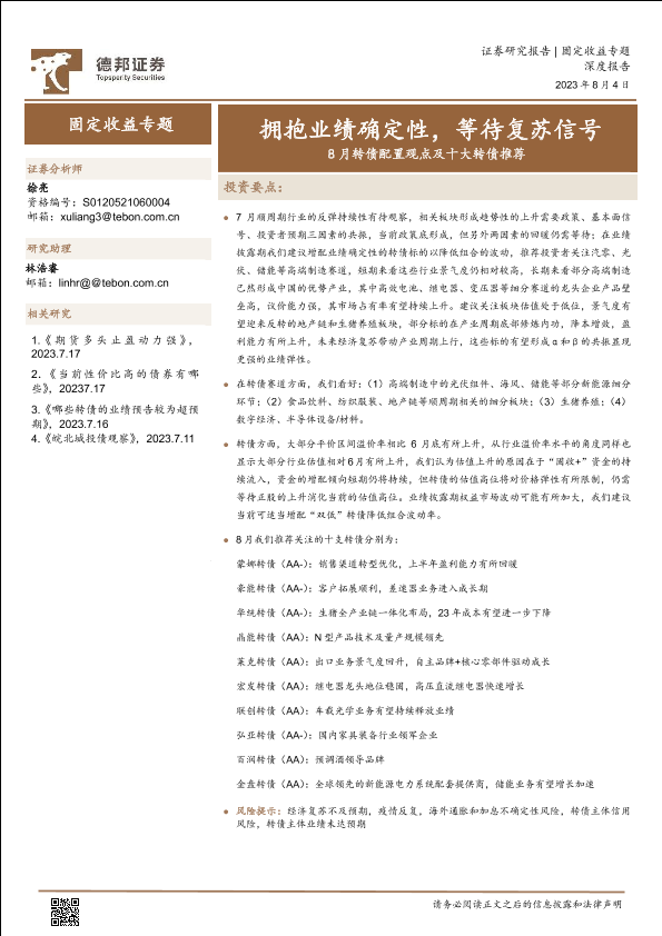 【德邦证券】【20230804】8月转债配置观点及十大转债推荐:拥抱业绩确定性,等待复苏信号-20页
