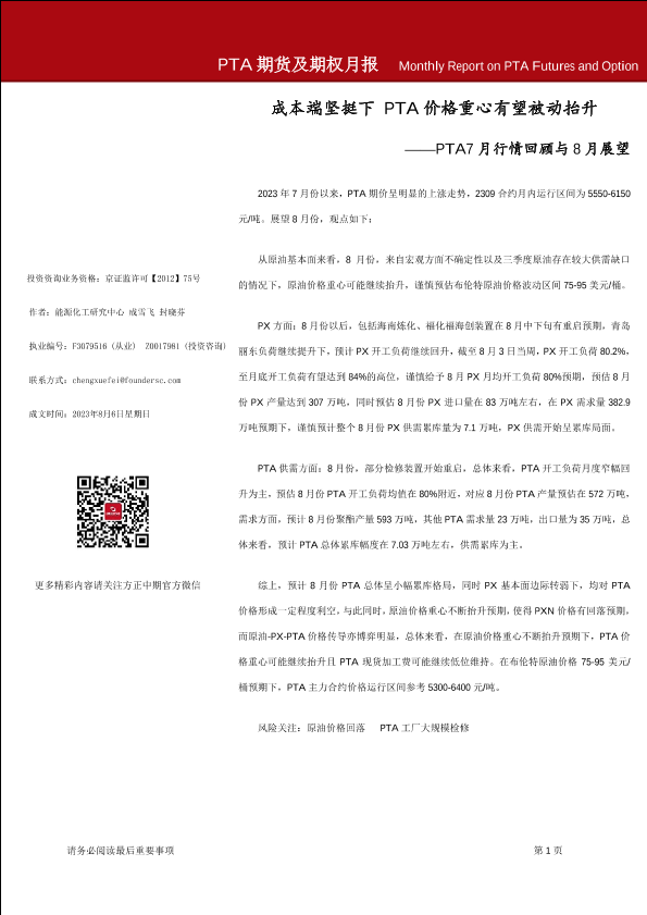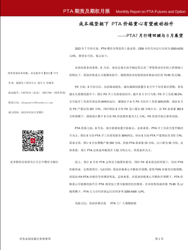 【方正中期期货】【20230806】PTA7月行情回顾与8月展望:成本端坚挺下,PTA价格重心有望被动抬升-23页