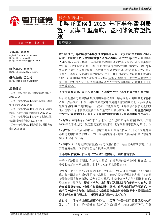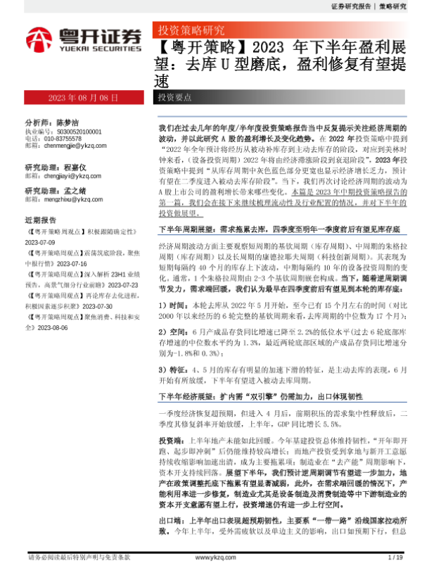 【粤开证券】【20230808】【粤开策略】2023年下半年盈利展望:去库U型磨底,盈利修复有望提速-19页