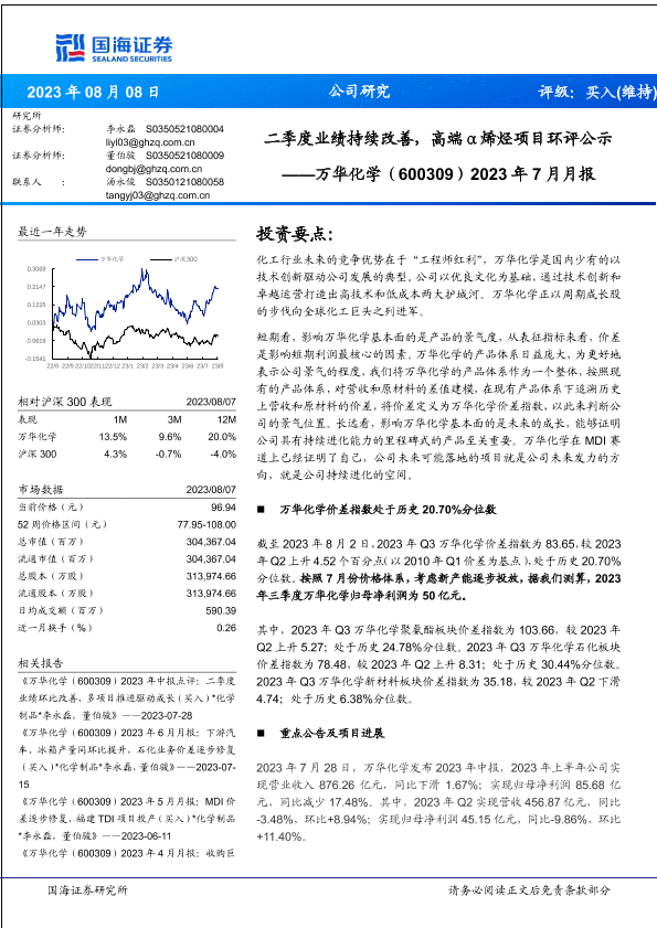 【国海证券】【20230808】万华化学2023年7月月报:二季度业绩持续改善,高端α烯烃项目环评公示-35页