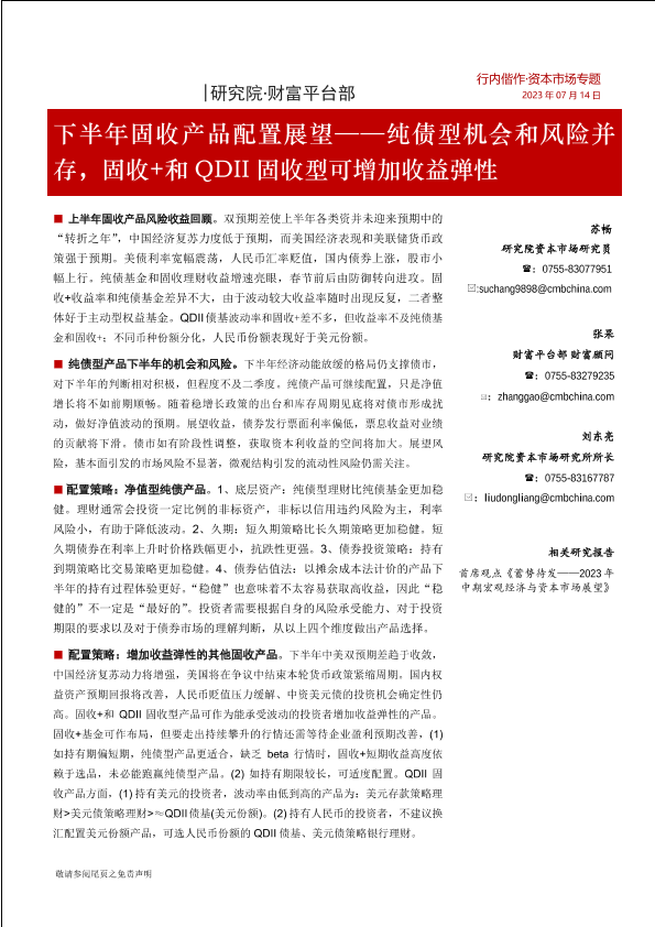 【招商银行】【20230714】下半年固收产品配置展望:纯债型机会和风险并存,固收+和QDII固收型可增加收益弹性-15页