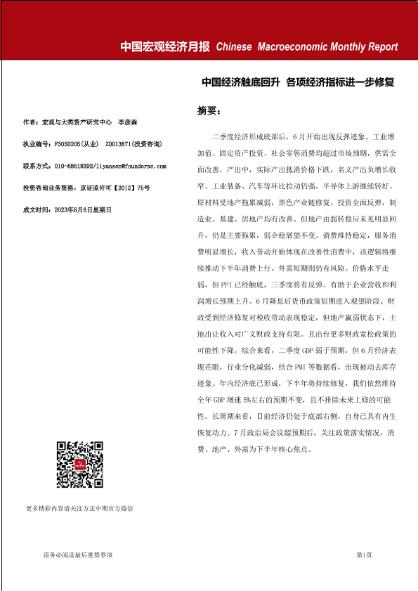 【方正中期期货】【20230806】中国宏观经济月报:中国经济触底回升,各项经济指标进一步修复-22页