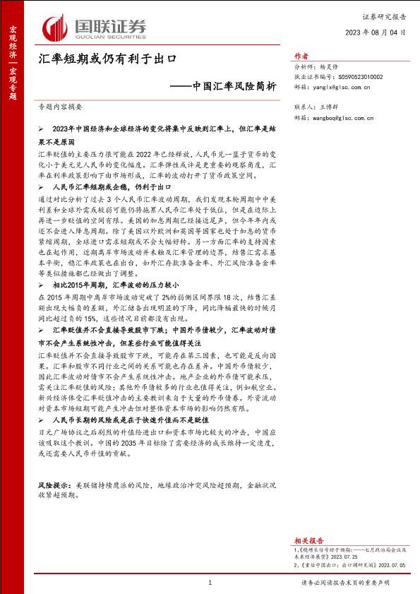 【国联证券】【20230804】中国汇率风险简析:汇率短期或仍有利于出口-40页