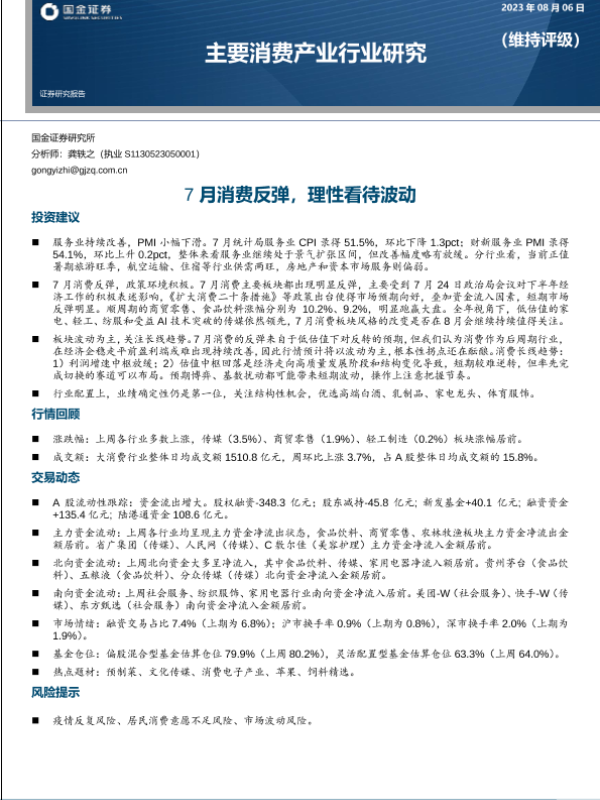 【国金证券】【20230806】主要消费产业行业研究:7月消费反弹,理性看待波动-19页