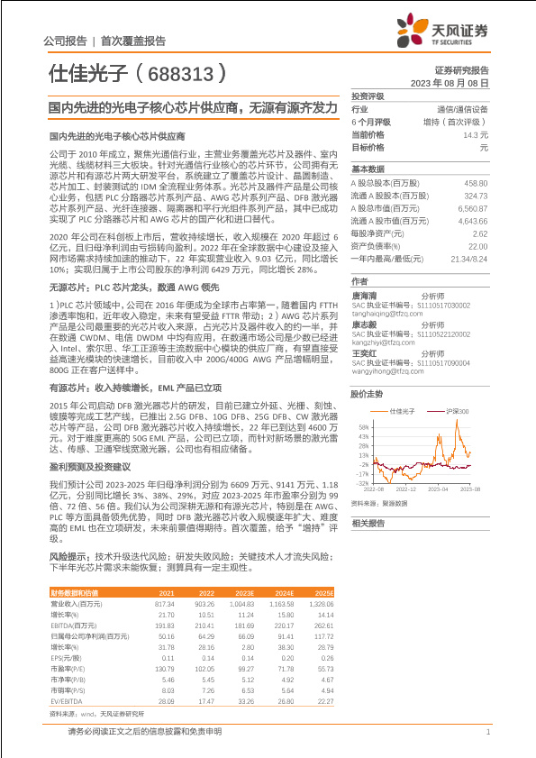 【天风证券】【20230808】仕佳光子(688313)国内先进的光电子核心芯片供应商,无源有源齐发力-23页