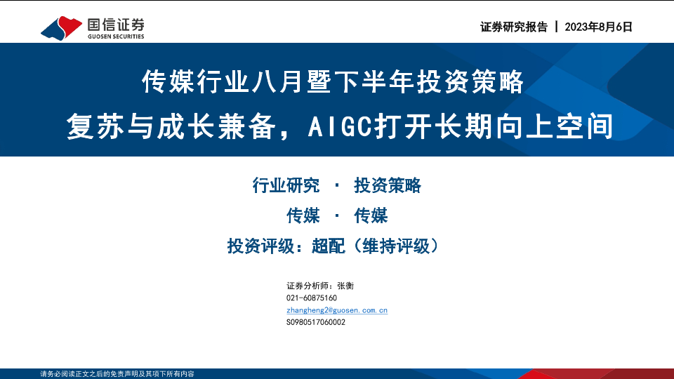 【国信证券】【20230706】传媒行业八月暨下半年投资策略:复苏与成长兼备,AIGC打开长期向上空间-46页