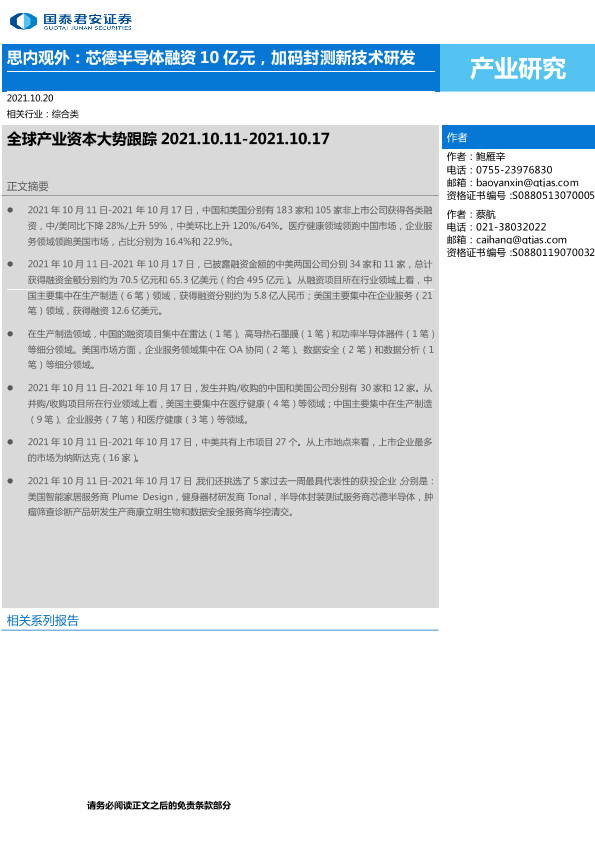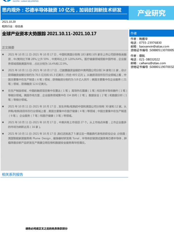 【国泰君安证券】【20211020】全球产业资本大势跟踪:思内观外,芯德半导体融资10亿元,加码封测新技术研发-20页