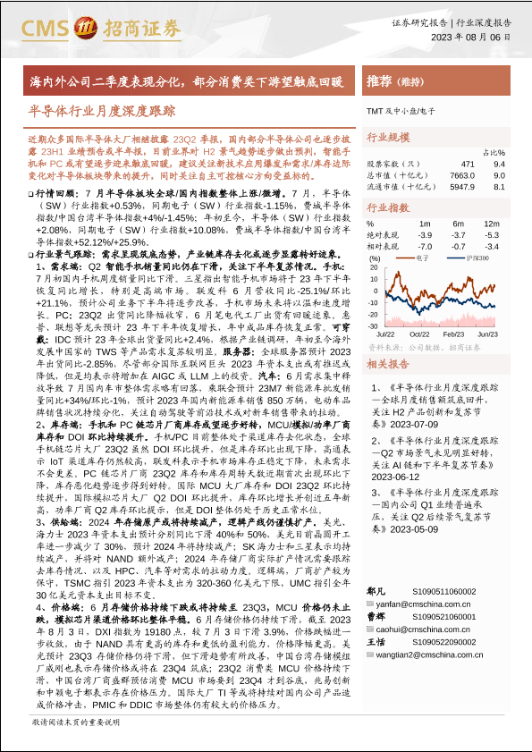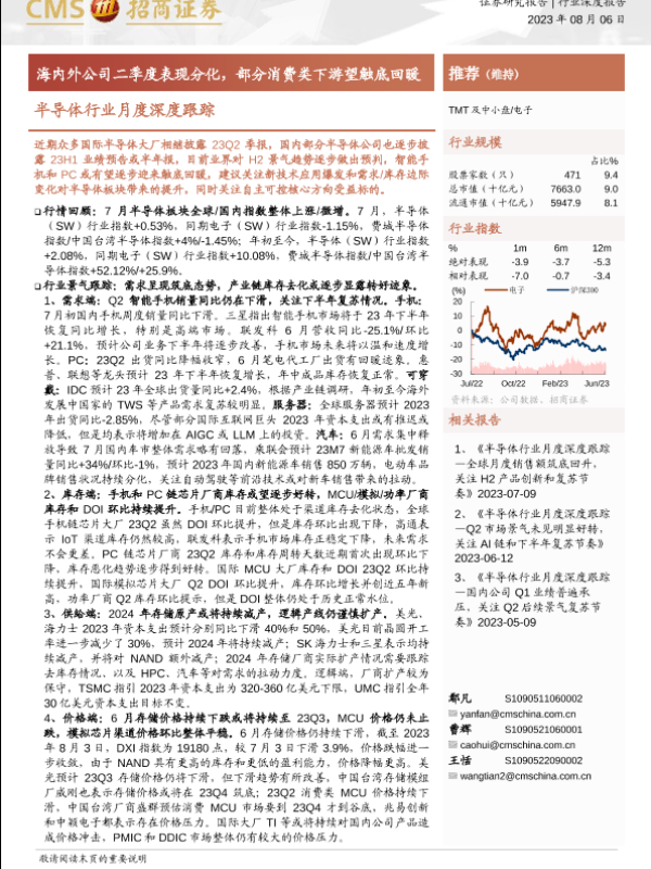 【海通证券】【20230806】半导体行业月度深度跟踪:海内外公司二季度表现分化,部分消费类下游望触底回暖-66页