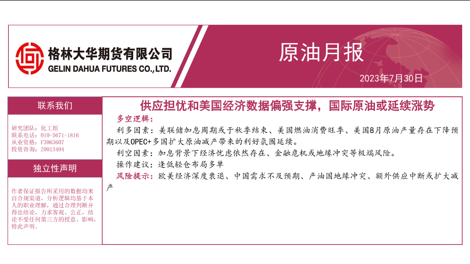 【格林大华期货】【20230730】原油月报:供应担忧和美国经济数据偏强支撑,国际原油或延续涨势-18页