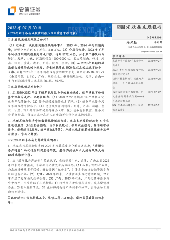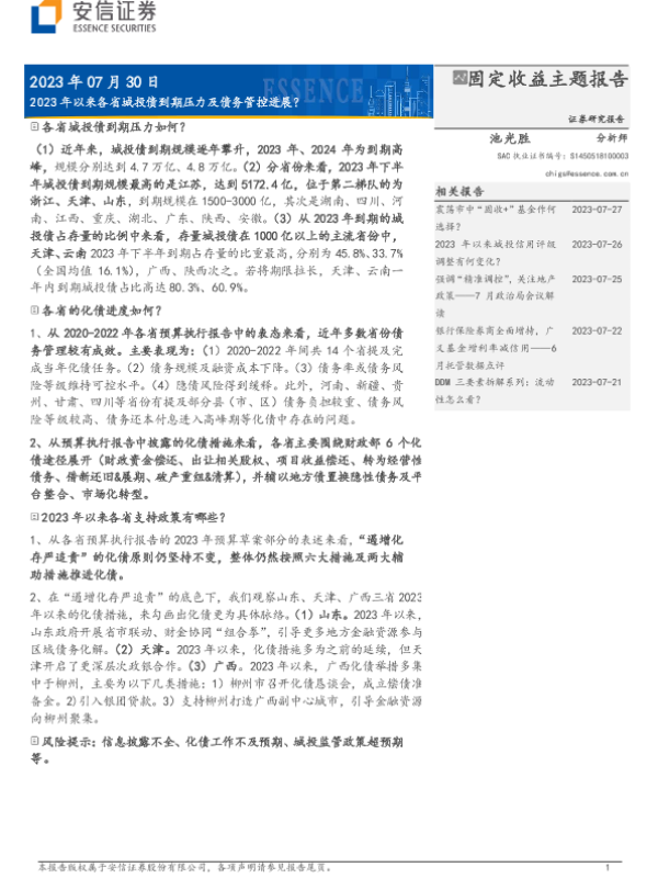 【安信证券】【20230730】固定收益主题报告:2023年以来各省城投债到期压力及债务管控进展-15页