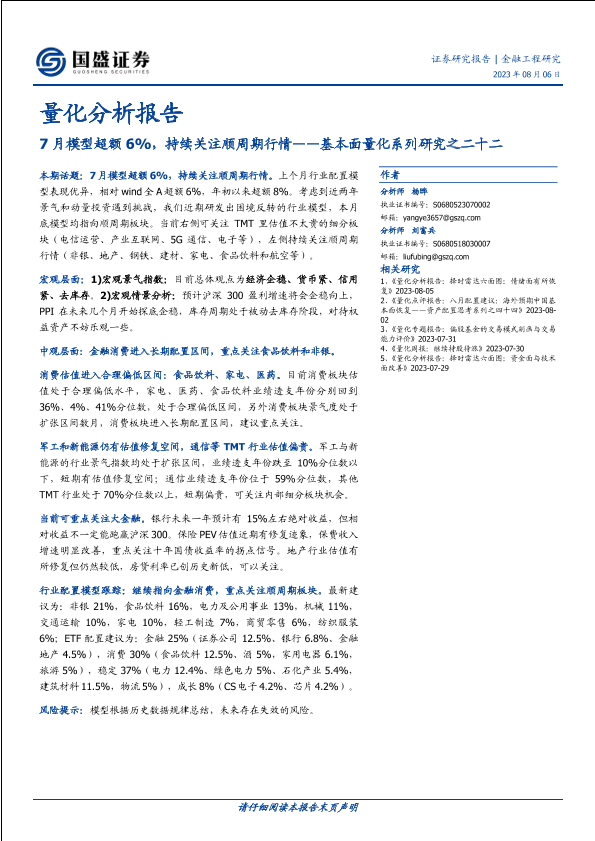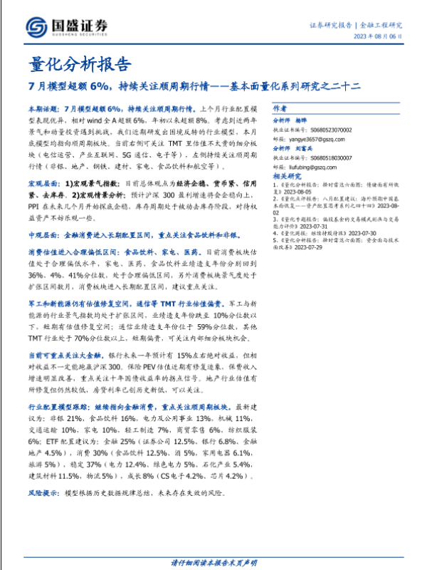 【国盛证券】【20230806】基本面量化系列研究之二十二:7月模型超额6%,持续关注顺周期行情-18页