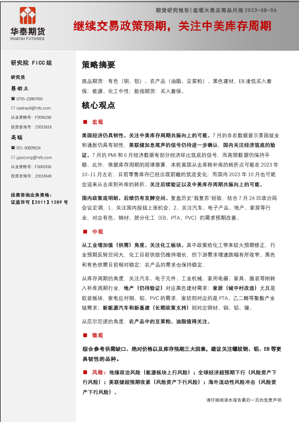 【华泰期货】【20230806】宏观大类及商品月报:继续交易政策预期,关注中美库存周期-25页