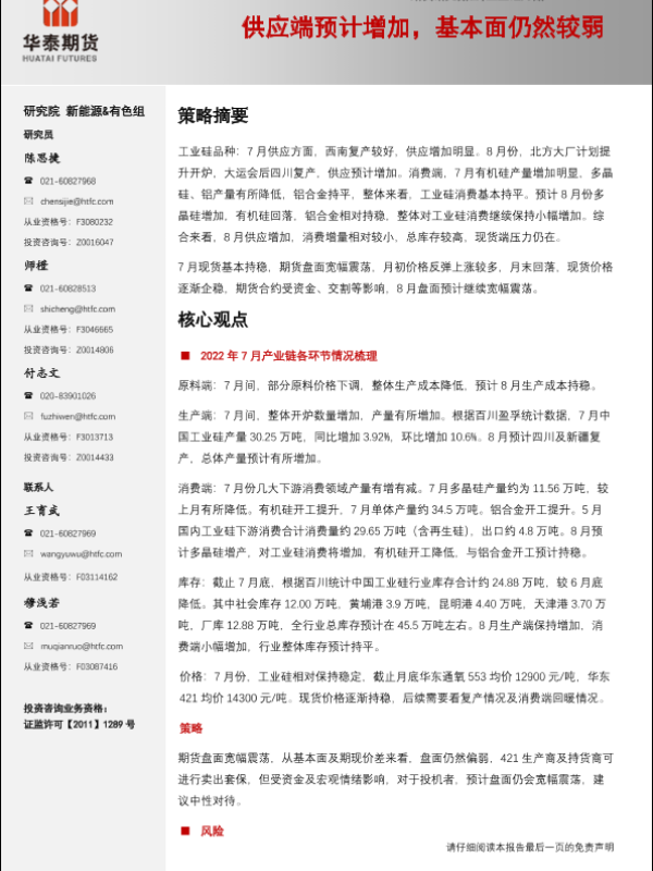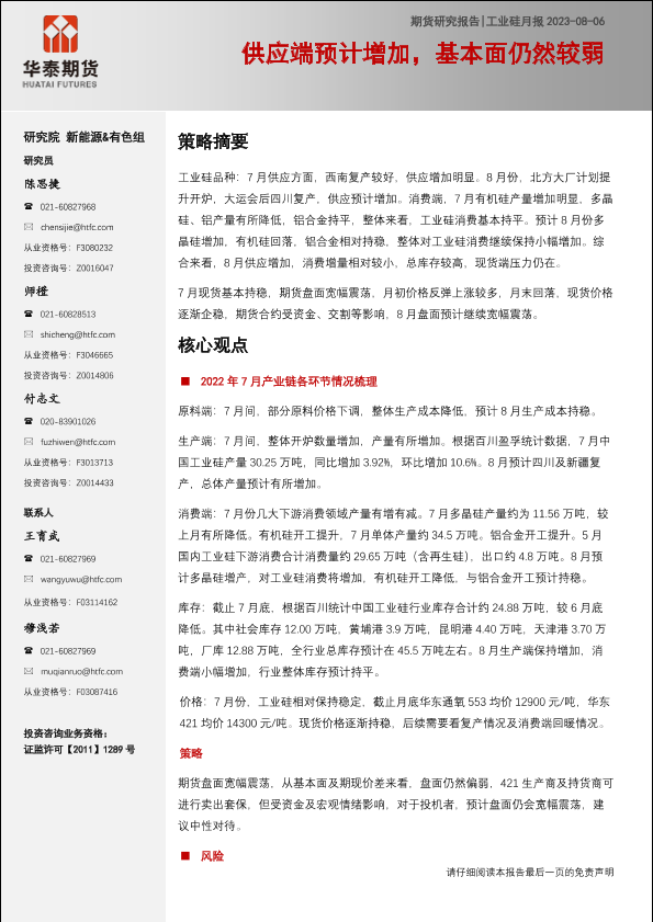 【华泰期货】【20230806】工业硅月报:供应端预计增加,基本面仍然较弱-19页