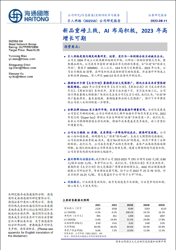 【海通国际】【20230811】巨人网络(002558)新品重磅上线,AI布局积极,2023年高增长可期-33页