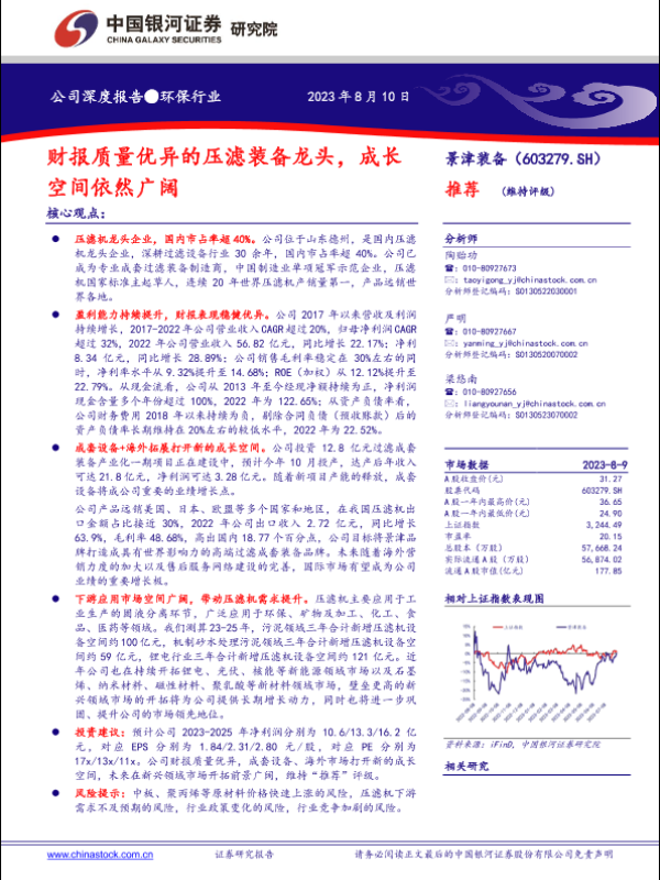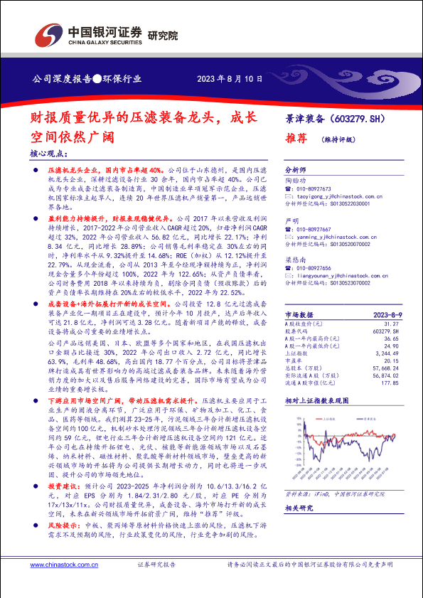 【银河证券】【20230810】景津装备(603279)财报质量优异的压滤装备龙头,成长空间依然广阔-30页