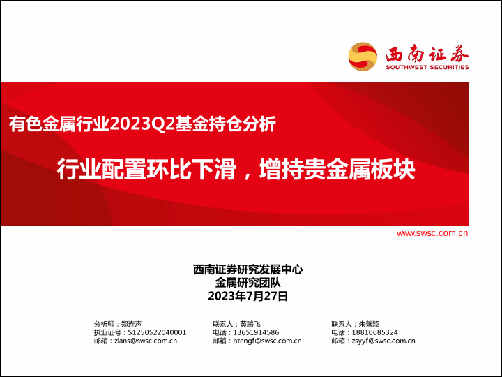 【西南证券】【20230727】有色金属行业2023Q2基金持仓分析:行业配置环比下滑,增持贵金属板块-18页