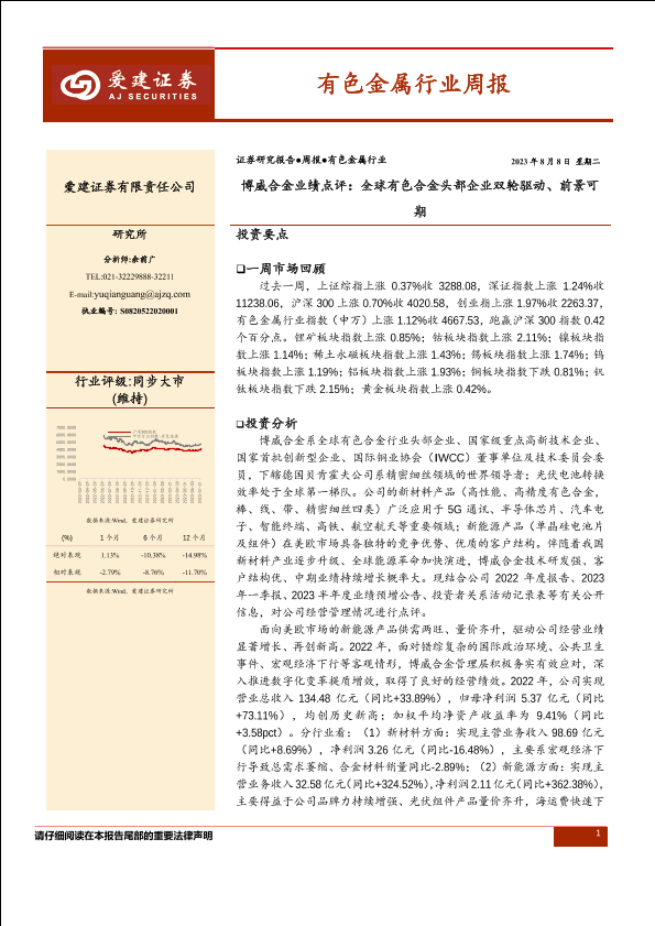 【爱建证券】【20230808】有色金属行业周报:博威合金业绩点评:全球有色合金头部企业双轮驱动、前景可期-45页