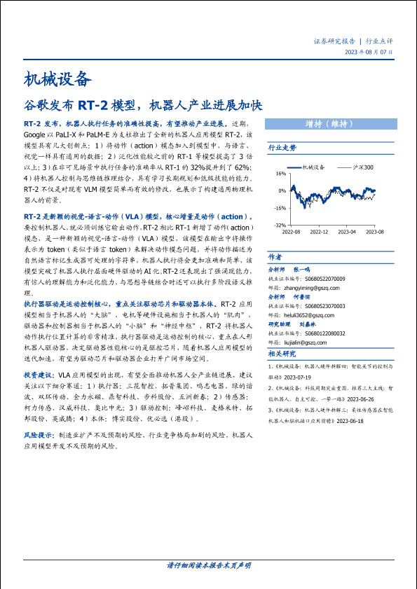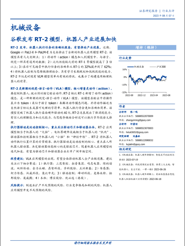【国盛证券】【20230807】机械设备行业:谷歌发布RT_2 模型,机器人产业进展加快-16页