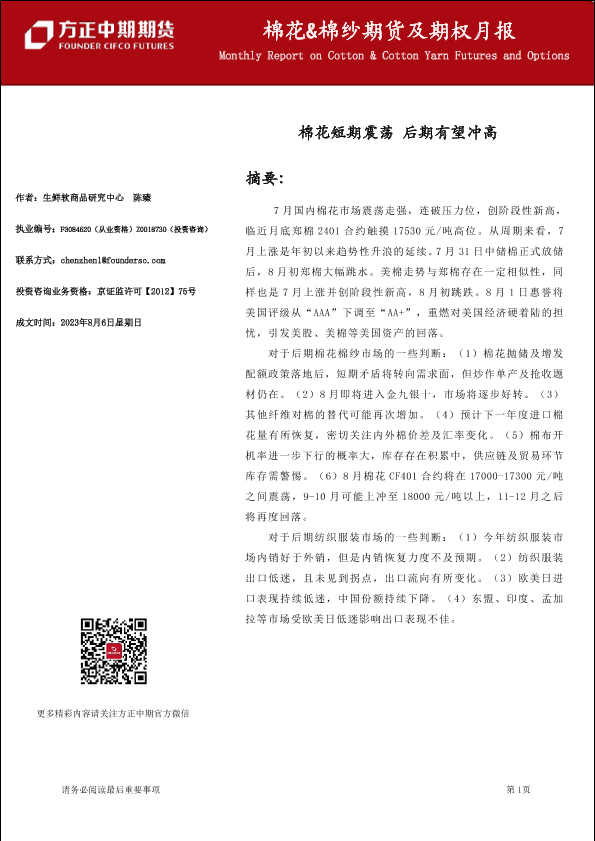 【方正中期期货】【20230806】棉花&棉纱期货及期权月报-24页