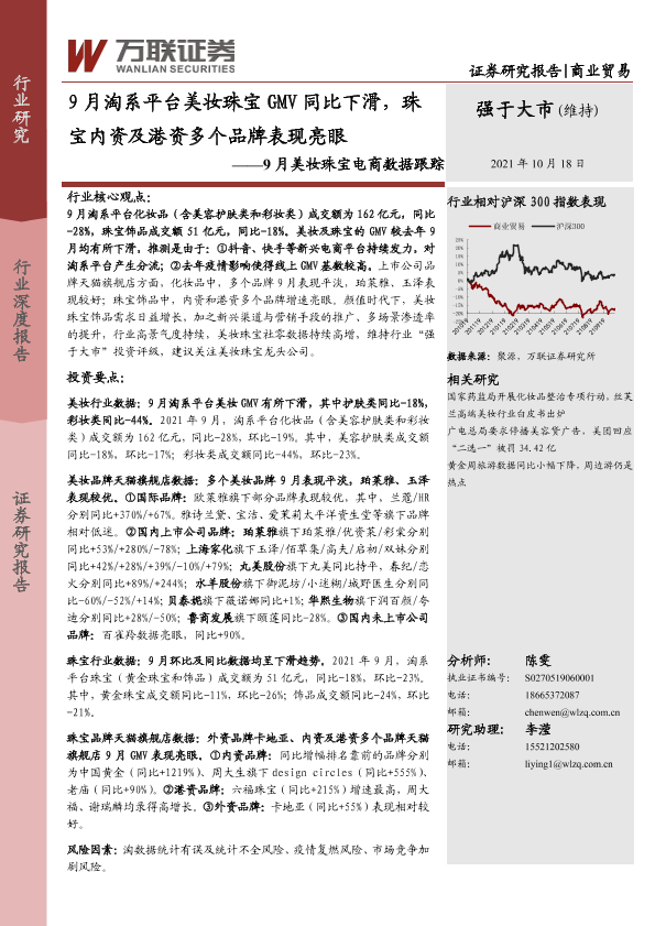 【万联证券】【20211018】商业贸易行业9月美妆珠宝电商数据跟踪:9月淘系平台美妆珠宝GMV同比下滑,珠宝内资及港资多个品牌表现亮眼-16页