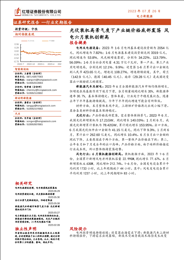 【红塔证券】【20230726】电力新能源行业:光伏装机高景气度下产业链价格底部震荡,风电六月装机创新高-18页