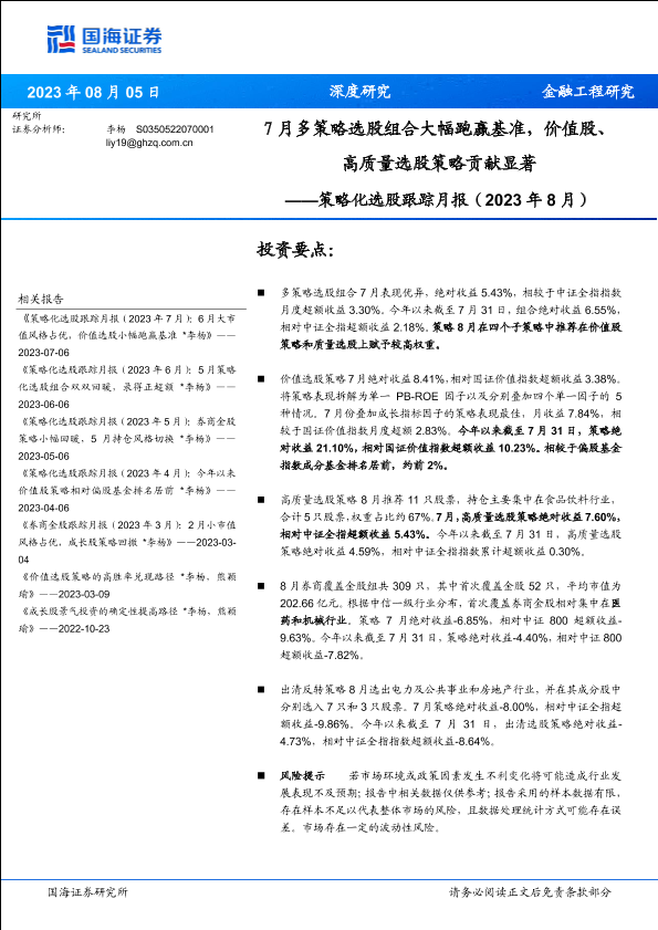 【国海证券】【20230805】策略化选股跟踪月报(2023年8月):7月多策略选股组合大幅跑赢基准,价值股、高质量选股策略贡献显著-28页