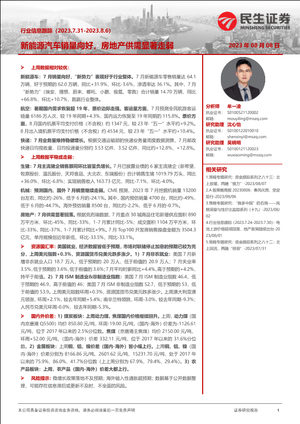 【民生证券】【20230808】行业信息跟踪:新能源汽车销量向好,房地产供需显著走弱-30页