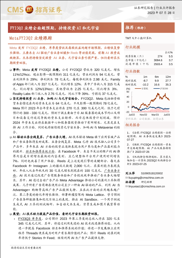 【海通证券】【20230728】计算机行业MetaFY23Q2业绩跟踪:FY23Q2业绩全面超预期,持续投资AI和元宇宙-19页