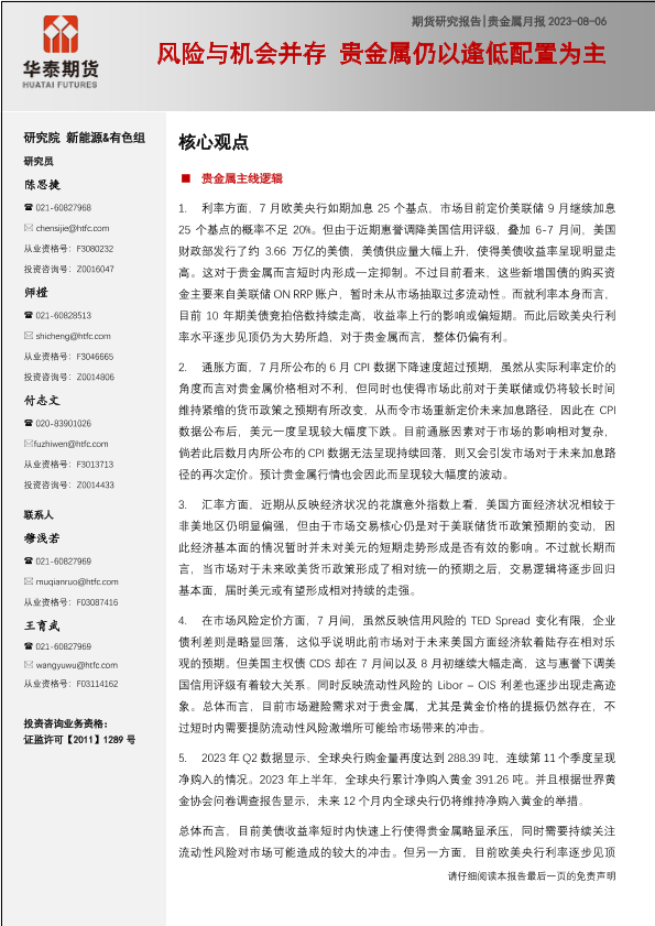 【华泰期货】【20230806】贵金属月报:风险与机会并存,贵金属仍以逢低配置为主-19页