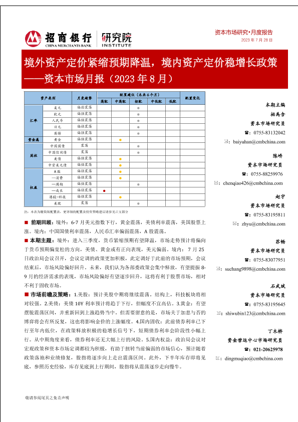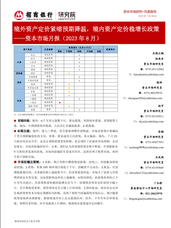 【招商银行】【20230728】资本市场月报(2023年8月):境外资产定价紧缩预期降温,境内资产定价稳增长政策-25页