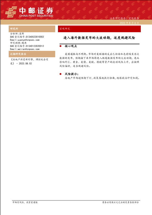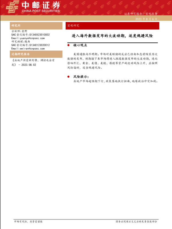 【中邮证券】【20230806】进入海外数据发布的大波动期,适度规避风险-24页