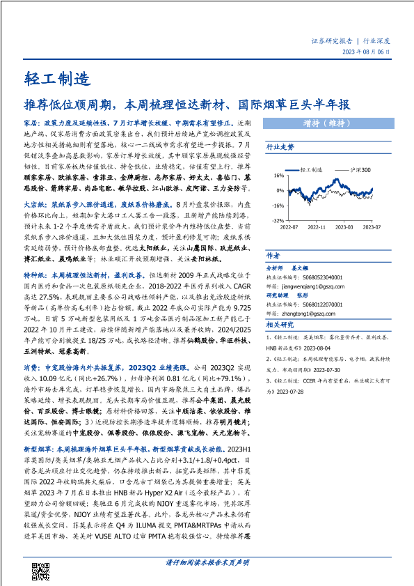 【国盛证券】【20230806】轻工制造行业:推荐低位顺周期,本周梳理恒达新材、国际烟草巨头半年报-42页
