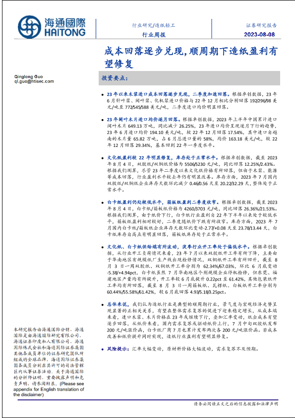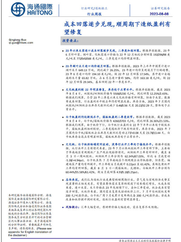 【海通国际】【20230807】造纸轻工行业周报:成本回落逐步兑现,顺周期下造纸盈利有望修复-21页