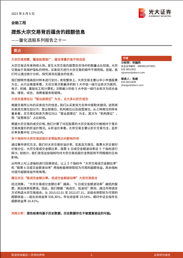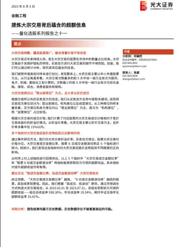 【光大证券】【20230805】量化选股系列报告之十一:提炼大宗交易背后蕴含的超额信息-23页