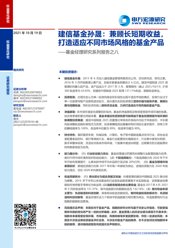 【申万宏源】【20211019】基金经理研究系列报告之八:建信基金孙晟,兼顾长短期收益,打造适应不同市场风格的基金产品-19页