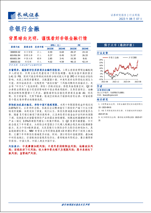 【长城证券】【20230807】非银行金融行业周报:背黑暗向光明,谨慎看好非银金融行情-32页