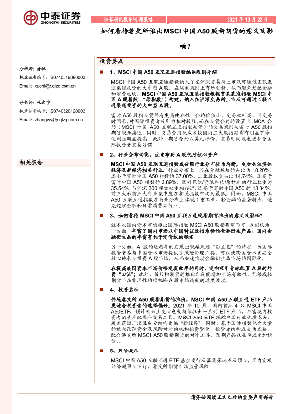 【中泰证券】【20211022】如何看待港交所推出MSCI中国A50股指期货的意义及影响?-18页