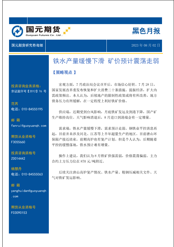 【国元期货】【20230802】黑色月报:铁水产量缓慢下滑,矿价预计震荡走弱-16页