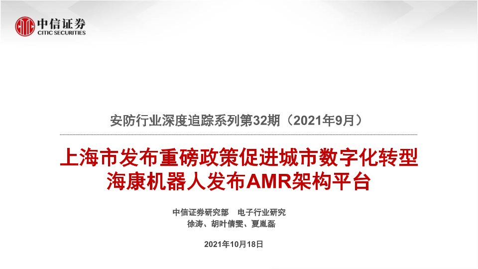 【中信证券】【20211018】安防行业深度追踪系列第32期(2021年9月):上海市发布重磅政策促进城市数字化转型,海康机器人发布AMR架构平台-21页