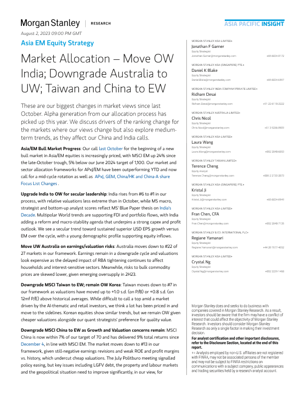 【Morgan Stanley】【20231004】Asia EM Equity Strategy Market Allocation – Move OW India; Downgrade Australia to UW; Taiwan and China to EW-62页