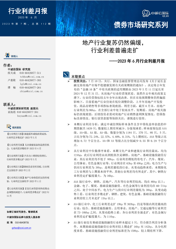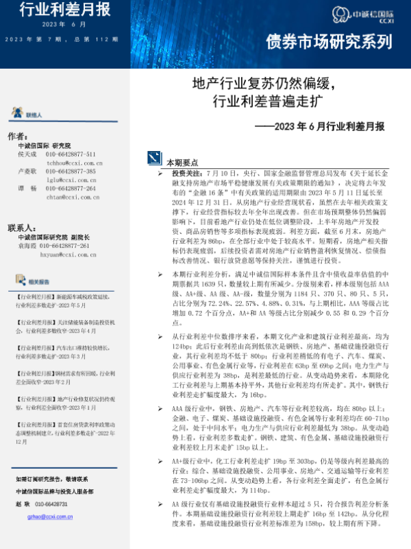 【中诚信国际】【202306】中诚信-地产行业复苏仍然偏缓,行业利差多数走扩-15页