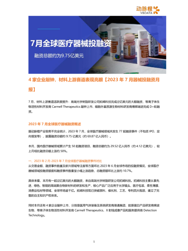 【动脉橙产业智库】【20230701】2023年7月器械投融资月报-6页