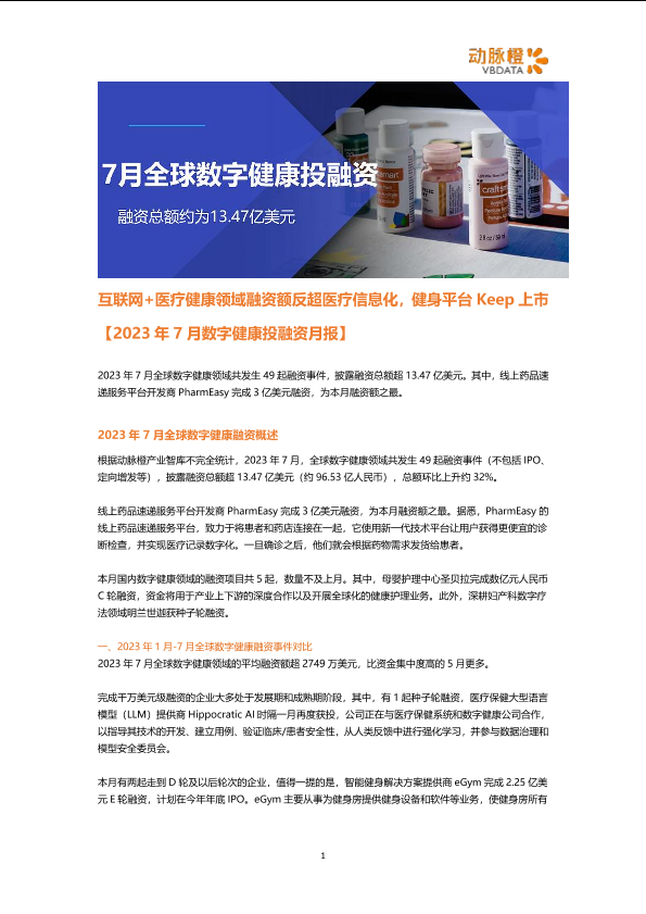 【动脉橙产业智库】【20230701】2023年7月数字健康投融资月报-6页