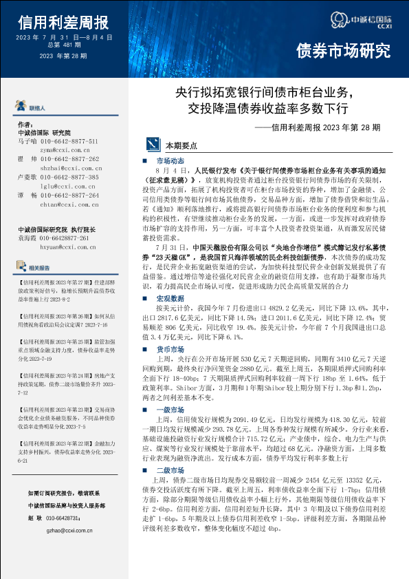 【中诚信国际】【20230804】信用利差周报2023年第28期:央行拟拓宽银行间债市柜台业务,交投降温债券收益率多数下行-16页